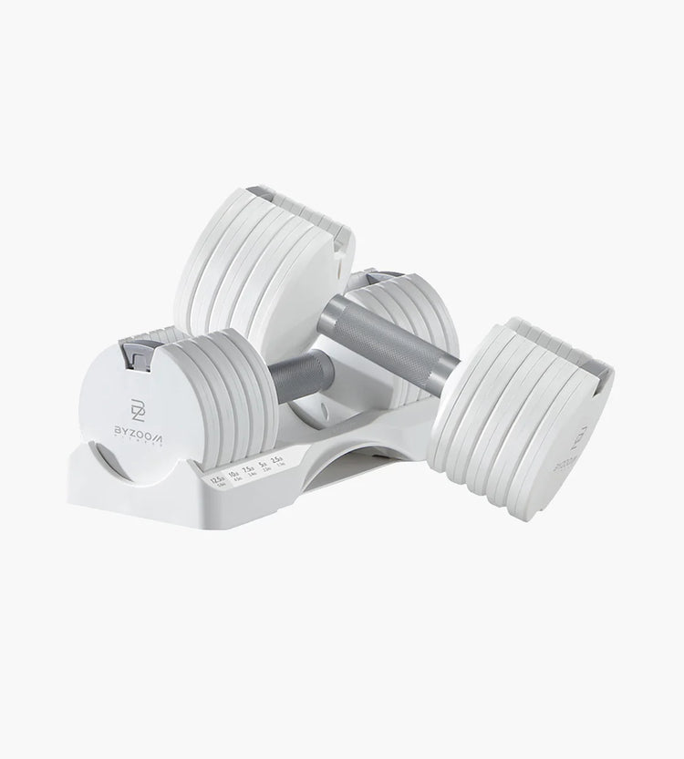 Le haltère ajustable Byzoom Fitness est inspiré par le design moderne de meubles, afin de s'intégrer parfaitement dans votre maison. Ainsi, il n'est plus nécessaire de le ranger laborieusement après l'entraînement, mais il devient élégamment une partie de votre décoration. Idéal pour les débutants ou comme partenaire pour le tapis de course.