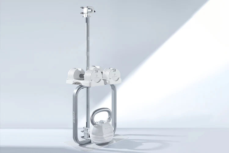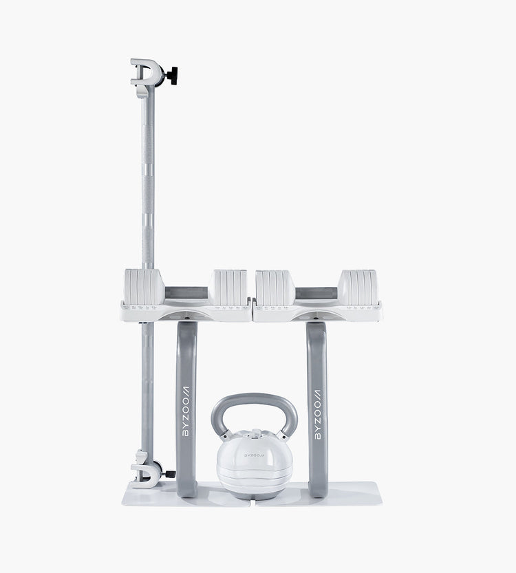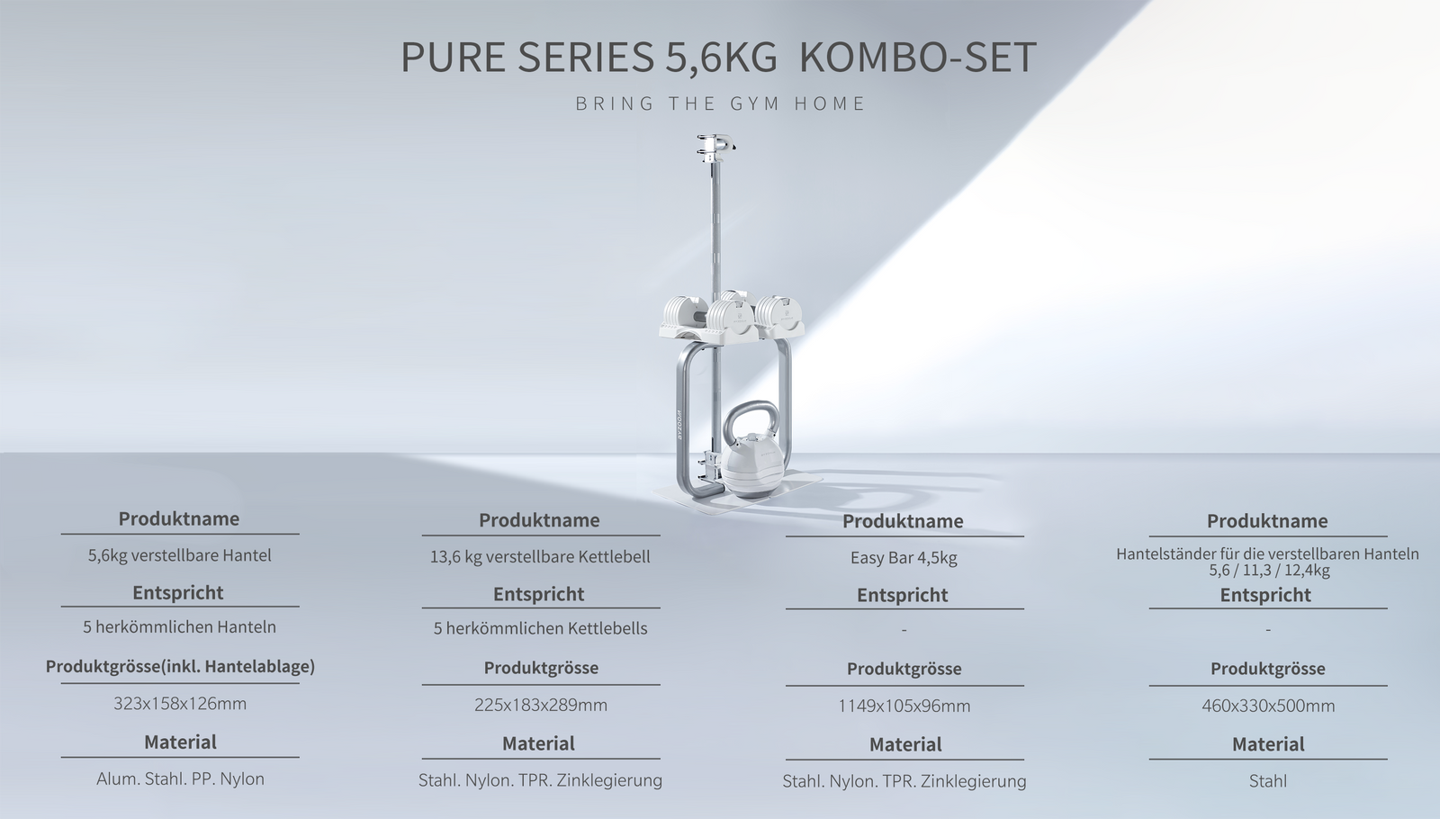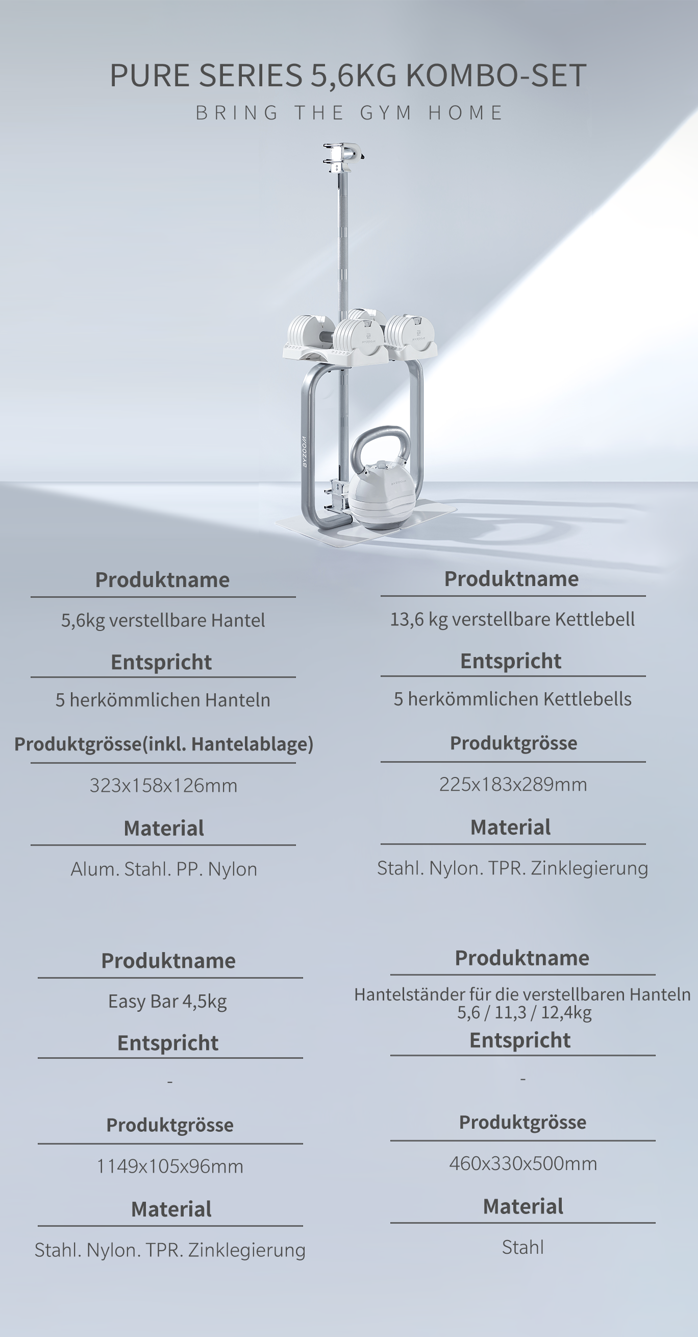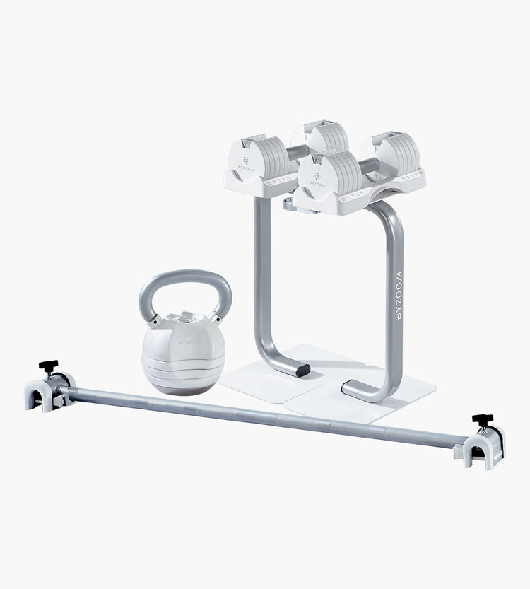 Une combinaison élégante pour votre home studio. Tout ce dont vous avez besoin pour votre entraînement à domicile - haltères, barres, supports pour haltères et kettlebell, le tout combiné en un seul ensemble. En blanc élégant, il s'intègre également dans tous les intérieurs.
